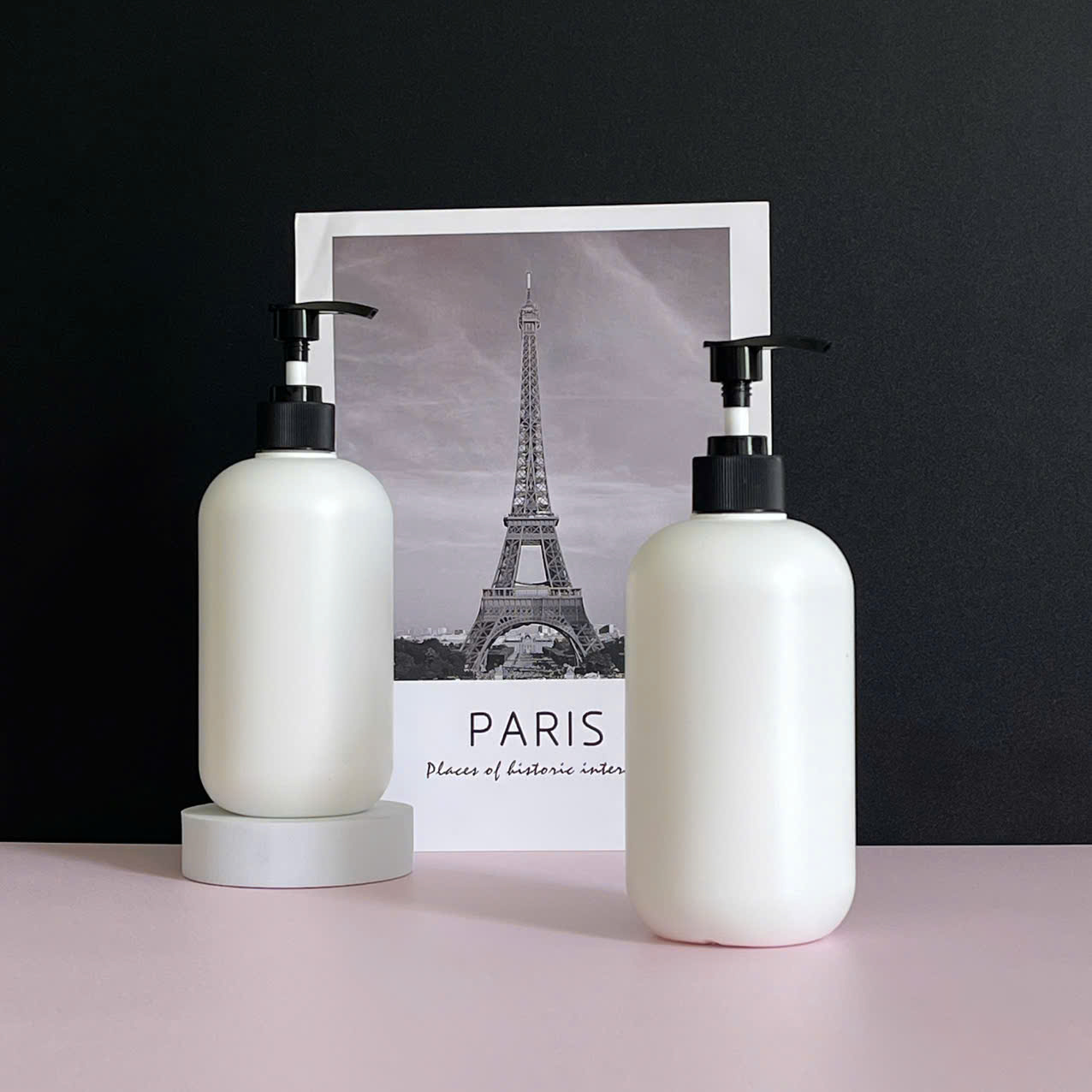 Chai HDPE tròn trắng vòi nhấn dẹp đen nhám 500ml