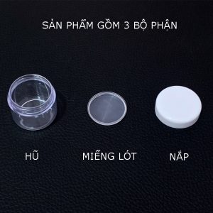 Sản phẩm gồm 3 bộ phận chính bao gồm hũ, miếng lót và nắp. Đặc biệt, hũ chiết kem tròn 50g có sẵn 3 màu nắp khác nhau để bạn lựa chọn gồm nắp đen, nắp trongnắp trắng. Điều này giúp cho bạn có nhiều sự lựa chọn hơn và phù hợp với thiết kế của sản phẩm của mình.